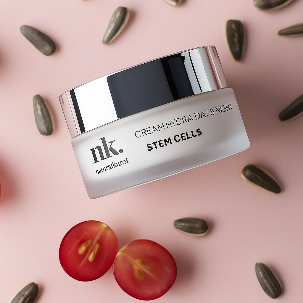 O NK Cream Hydra Day & Night contém resveratrol, células estaminais de uva, extrato de semente de uva, óleo de abacate e sementes de girassol.
